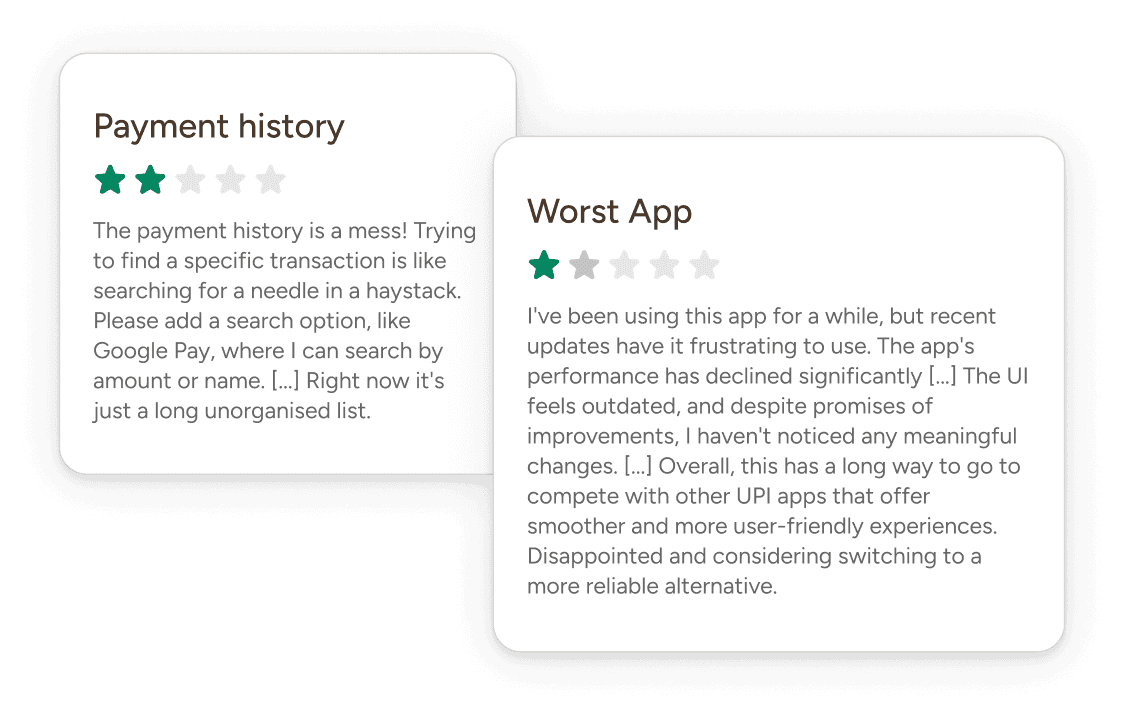 These reviews tell a deeper story than poor ratings—they reveal the cost of designing for India's top 10% while ignoring the remaining 90%. When payment apps prioritize sleek interfaces for English-speaking, digitally native users, they inadvertently exclude India2 & India3 audiences who need: