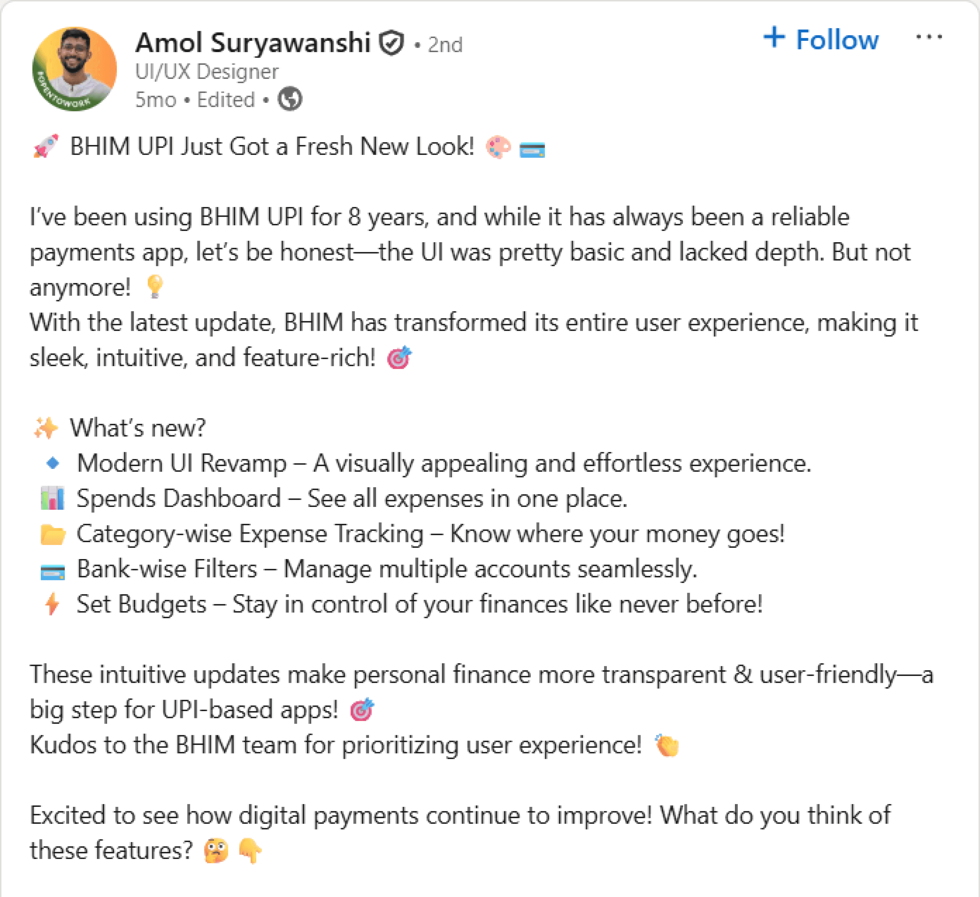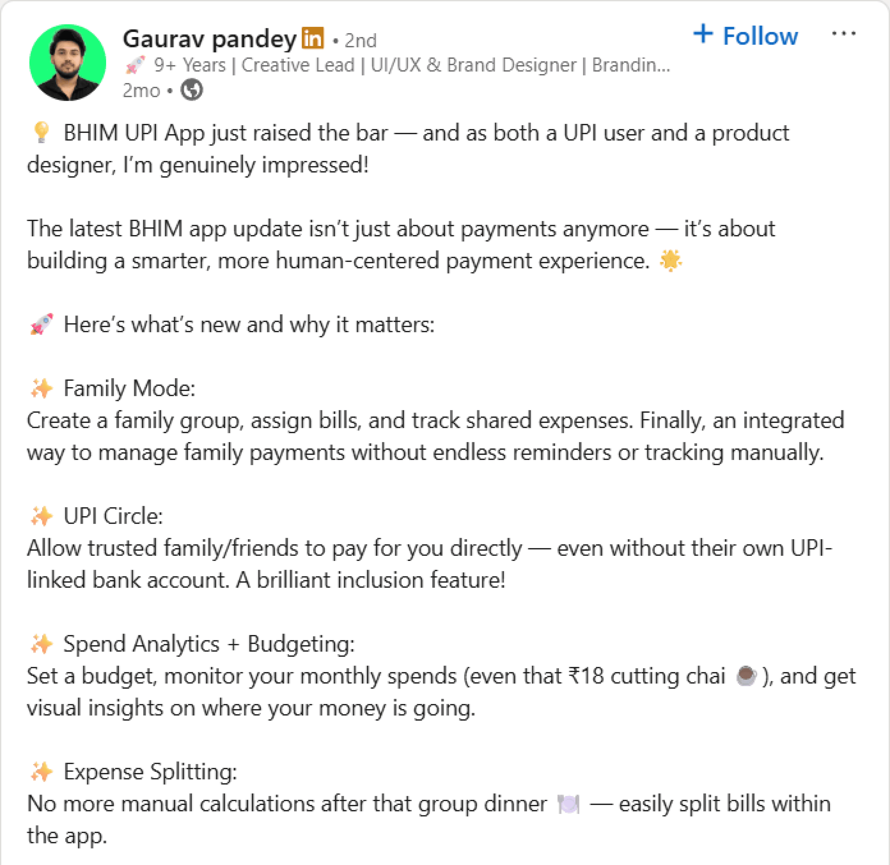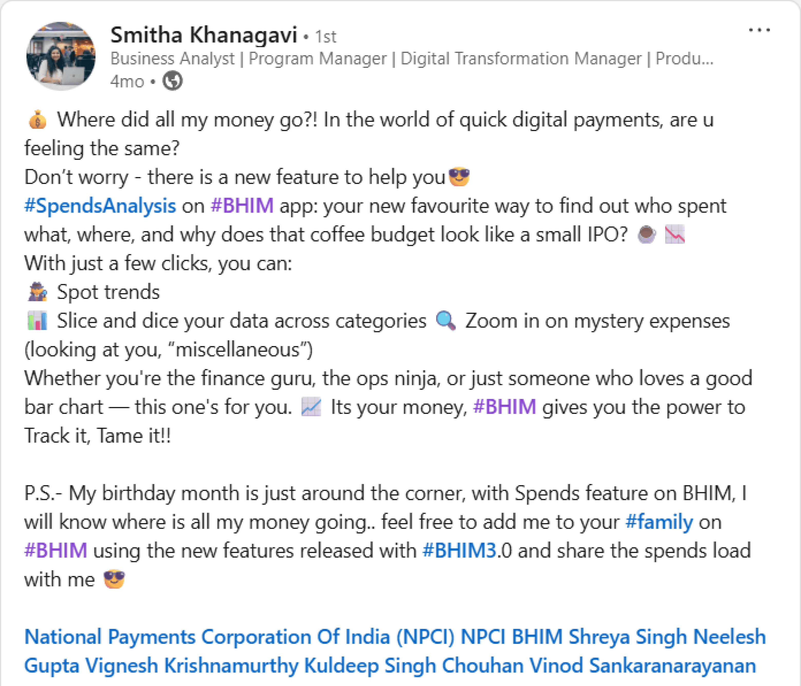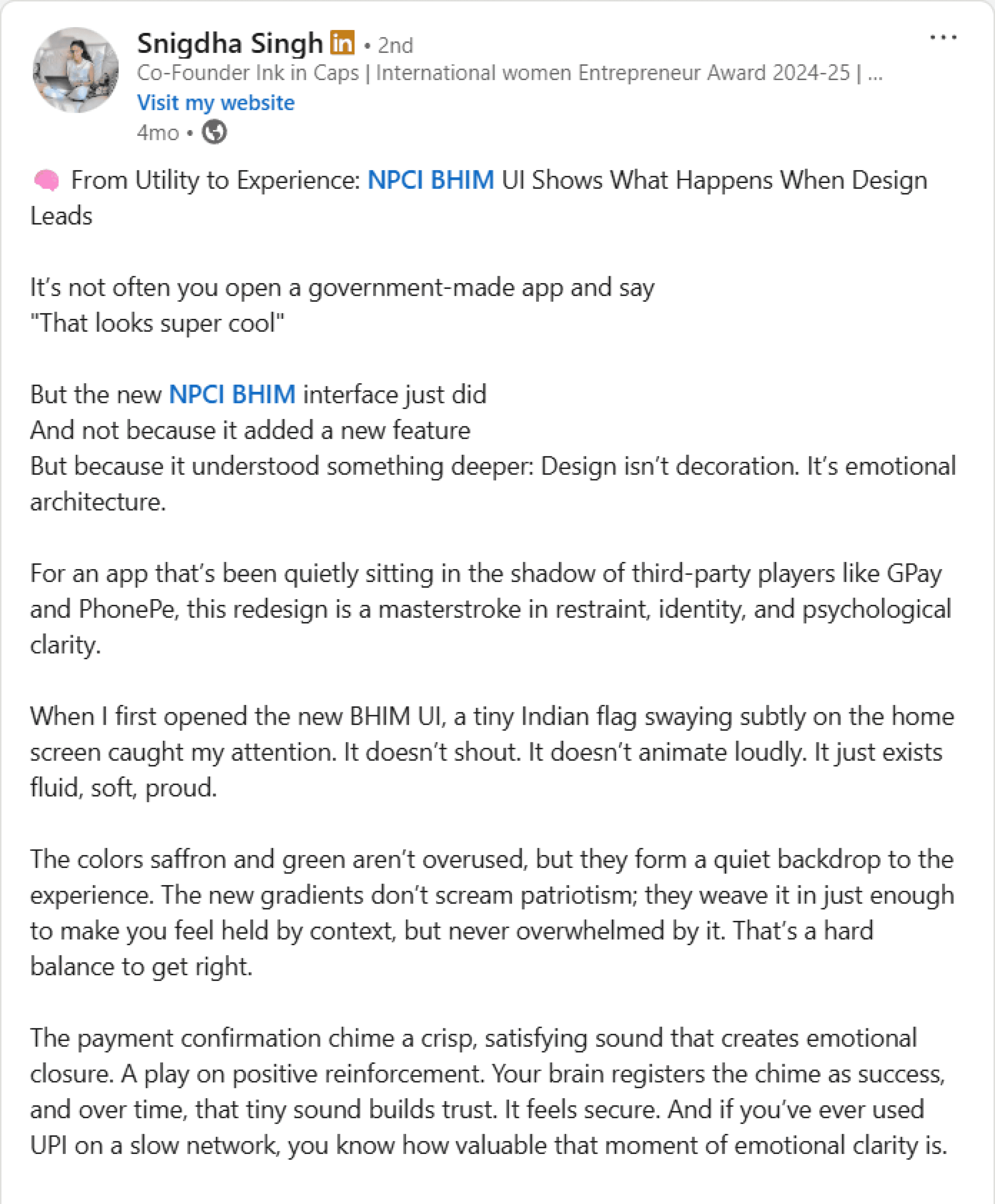 A personal win for me was a random day in August’25, as I stood in line at a pet supplies store’s checkout counter, seeing the old man ahead of me pay for his cat’s food using BHIM. When I asked him why he was using BHIM —
